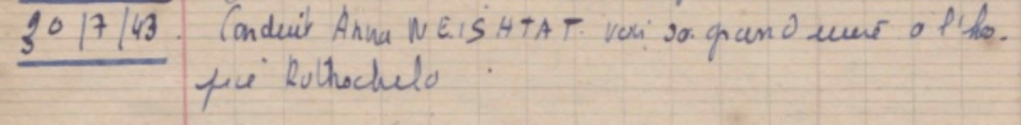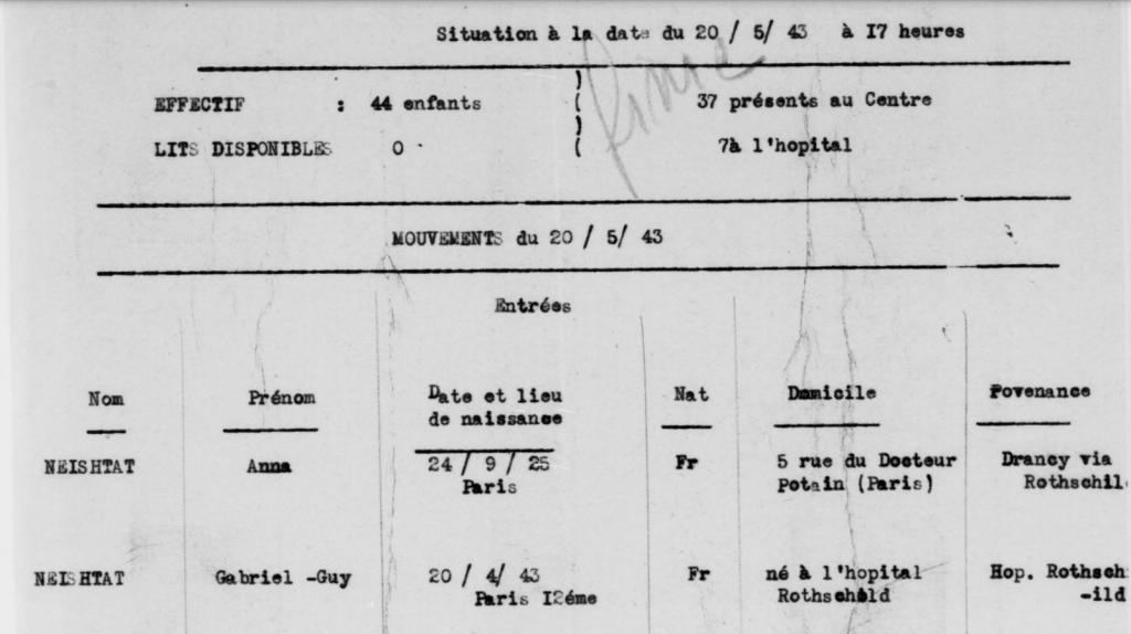 Anna Neishtat née en 1925, fille de Haïman Neishtat (1891-1942) et de Ryvka née Rykosynska (1891- ?), demeurant au 28, rue St Sébastien, Paris (11è). Haïman est interné à Pithiviers en août 1941 et déporté le 25 juin 1942 par le convoi 4. Anna donne naissance à un petit garçon, Gabriel Guy, en avril 1943 à l’hôpital Rothschild. Mère et enfant sont envoyés à Neuilly le mois suivant où Anna devient berceuse. Après la guerre, Anna est reconnue pour ses activités dans la Résistance. Elle sera assistante sociale.