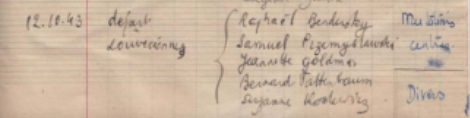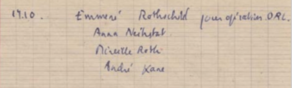 « J’ai trouvé en rentrant un pneu de la mère de Mme Schwartz me disant qu’elle venait de recevoir une carte de sa fille du 25 octobre de Birkenau. Françoise embrasse son père. Mme Robert Lévy et Lisette Bloch sont avec elles. »