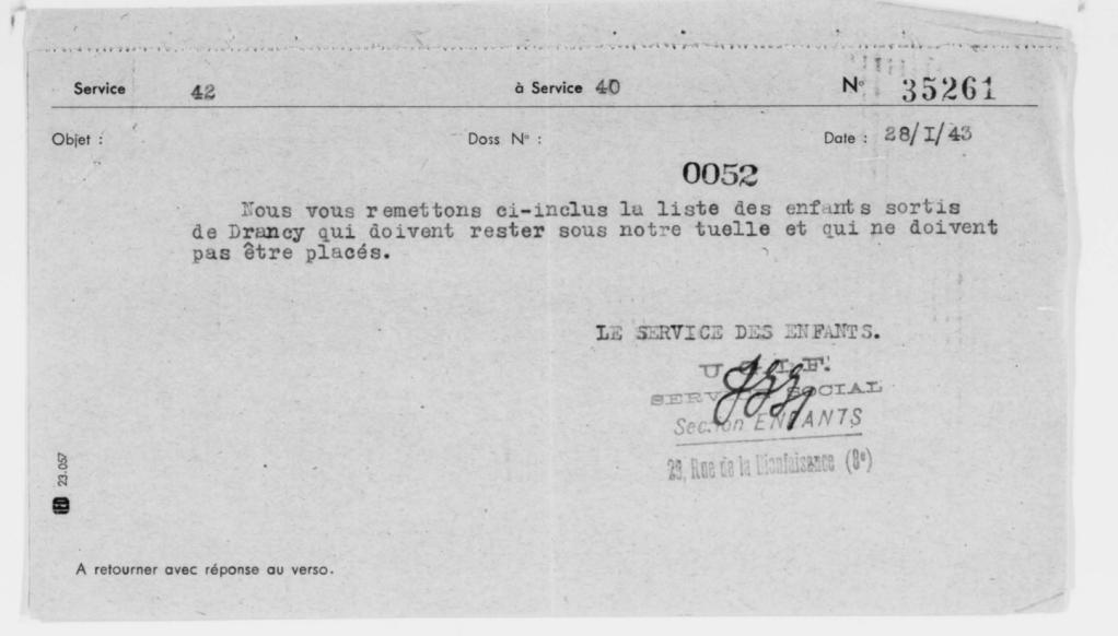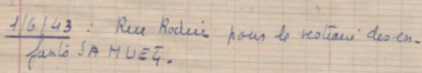 « J’ai emmené cinq petits à Lamarck, les plus jolis et les plus gentils. Si les gens qui m’aident dans le métro savaient ce que sont ces enfants, les petits dont les souvenirs de train se rapportent toujours au voyage qui les a amenés ou ramenés du camp, qui vous montrent un gendarme dans la rue en disant : « C’est un comme ça qui m’a ramené de Poitiers. » « Laissez venir à moi les petits enfants, a dit le Christ. »