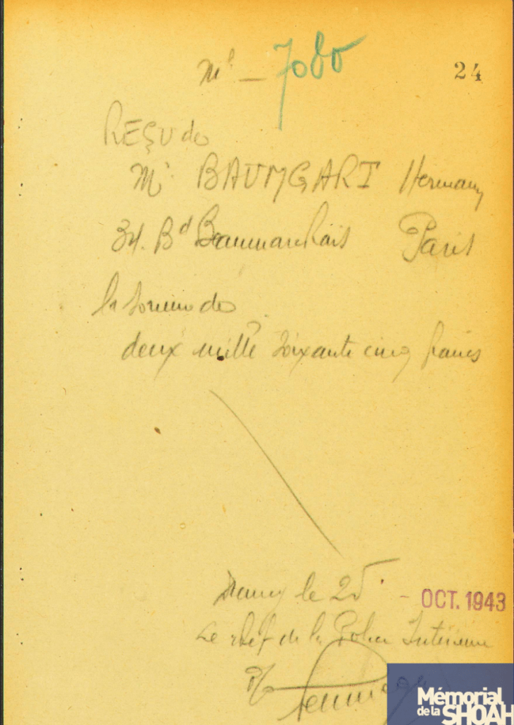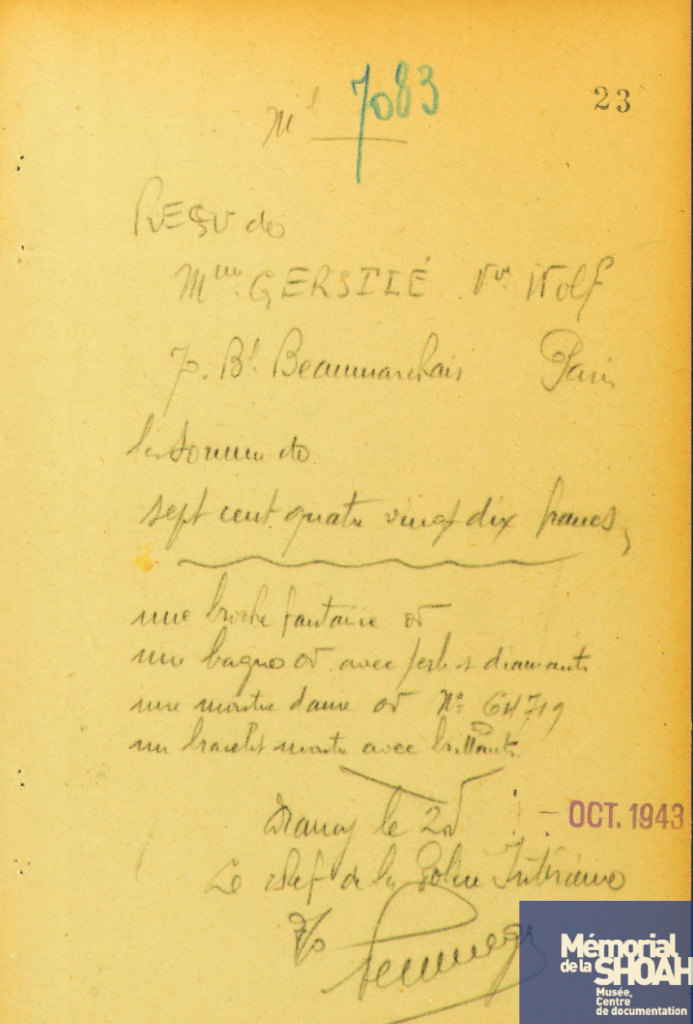 Marie « Georgette » Crémieux née Parmentier (1907-2004), demeurant 22, rue Fourcroy, Paris (16è), seconde épouse de Gaston Moïse Crémieux, (1891-1942). Avocat à la cour de Paris, il est arrêté en août 1941, interné à Drancy, où il occupe un poste de chef de service, puis déporté de Beaune-la-Rolande par le convoi 5 du 28 juin 1942.