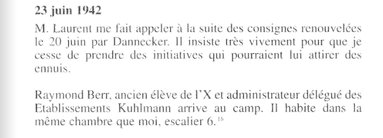 « En septembre 1944, est arrivé dans notre Kommando l’ingénieur Raymond Berr. Par un hasard étrange, sa femme, déportée avec lui, s’est retrouvée un temps dans le même block que ma mère. Elle n’a pas survécu. Berr était l’administrateur délégué des Etablissements Kuhlmann, le président aussi de l’Union des ingénieurs de France, un grand scientifique et un industriel important. Il était déjà âgé et, s’il n’avait pas été assassiné à son arrivée, c’était à cause de ses compétences. Affecté au Kommando de chimie, il était autorisé à nous quitter après dix minutes de travaux de force pour aller laver la verrerie dans un laboratoire.