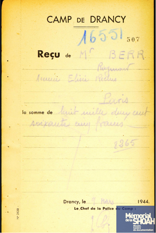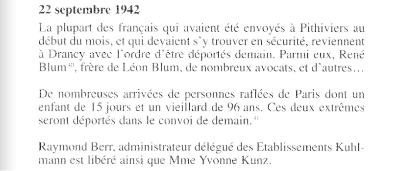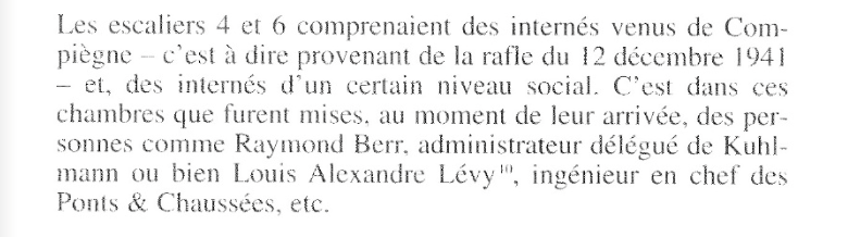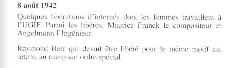 Raymond Berr n’a pas survécu longtemps, malgré le statut « privilégié » qu’on lui avait accordé. Il souffrait terriblement de la faim, se jetait sur les moindres restes, même sur les os à ronger. Tous les détenus n’étaient pas égaux devant la faim, chacun la percevait avec une acuité différente. Berr est mort le 27 septembre 1944, alors qu’il avait étee admis à l’infirmerie du camp. On disait qu’il avait été assassiné. » (p.45)