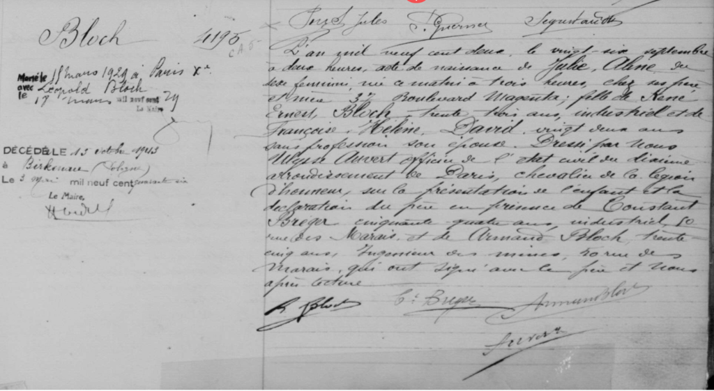 Acte de naissance de Julie « Lisette » Bloch.