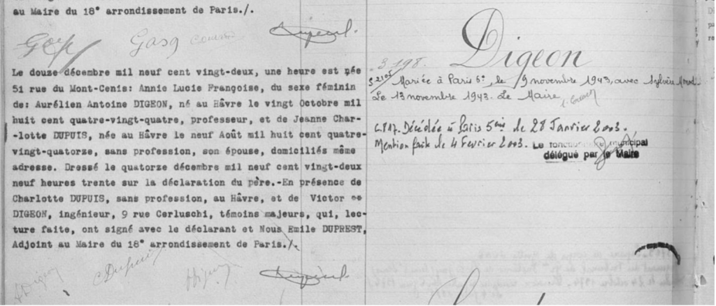 Acte de naissance d’Annie Digeon.