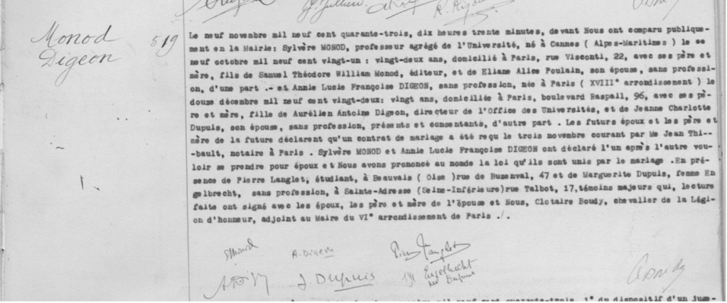 Acte de mariage de Sylvère Monod et Annie Digeon.