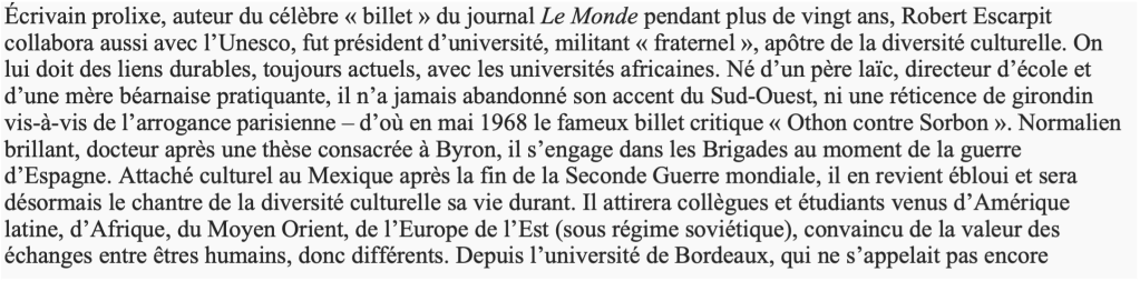 Extrait de Robert Escarpit (1918-2000). Hommage à un centenaire plein de vie d’Anne-Marie Laulan :