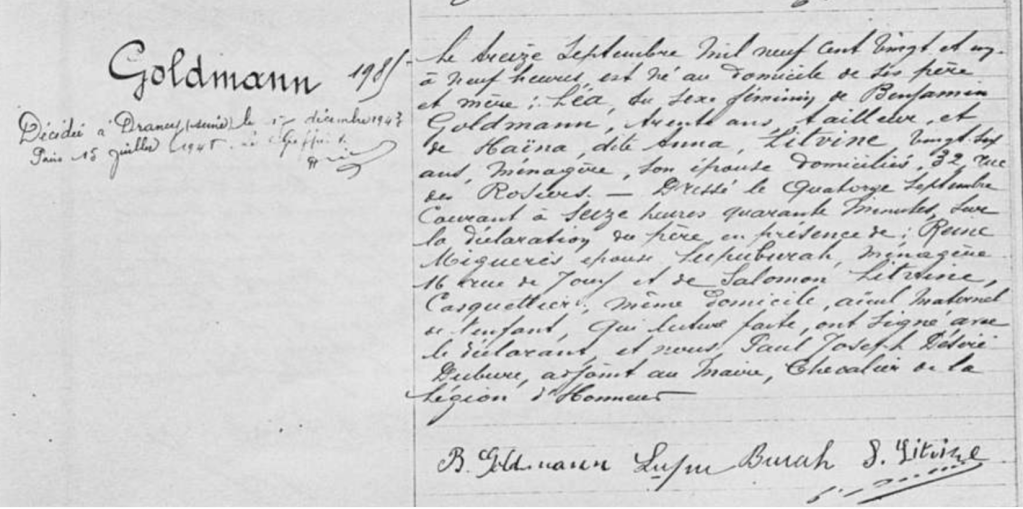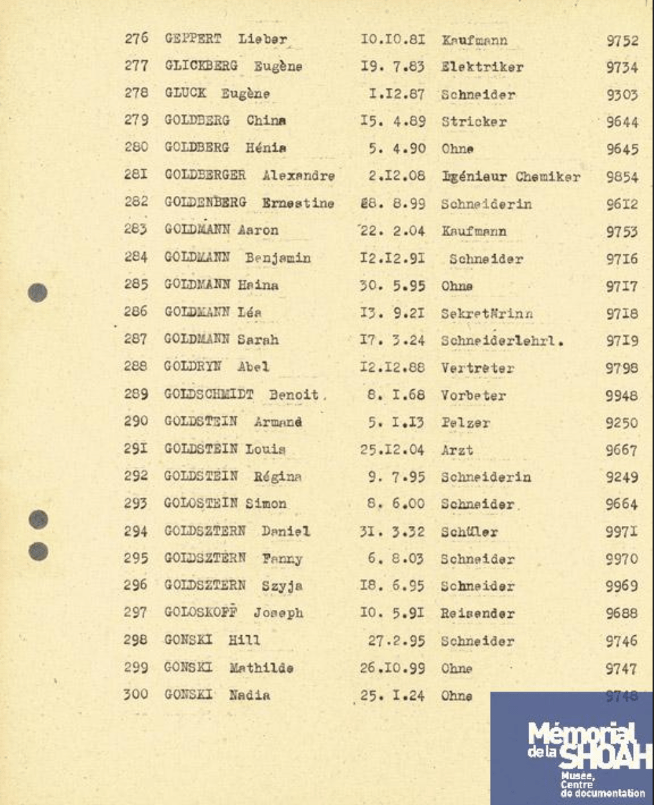 Liste du convoi 63 sur laquelle la famille Goldmann apparaît.