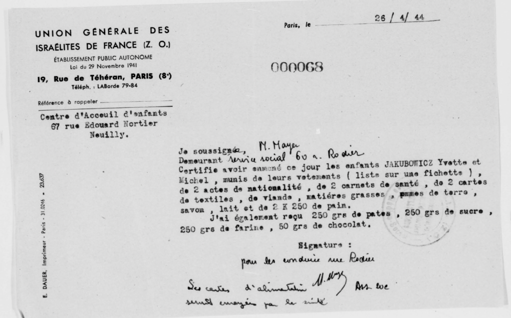Daily reports, 1944 (MK 490.45, RG 210, vue 14/51) Source : YIVO Institute for Jewish ResearchCertificates by nurses indicating that they have taken over children from the Marguerite Nursery as well as their cards for food and clothing, Oct. 9, 1942 – July 10, 1944 (MK 490.45, RG 210, vue 79/99) Source : YIVO Institute for Jewish Research