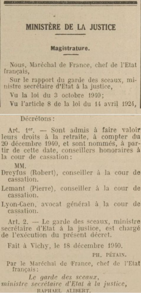 On reconnaît le nom de Léon Lyon-Caen – bien que son prénom ne soit pas mentionné – et celui de Robert Dreyfus, cousin de Raymon Berr, sur la liste d’avocats juifs exclus de leurs fonctions Journal Officiel de la République Française, 19 décembre 1940