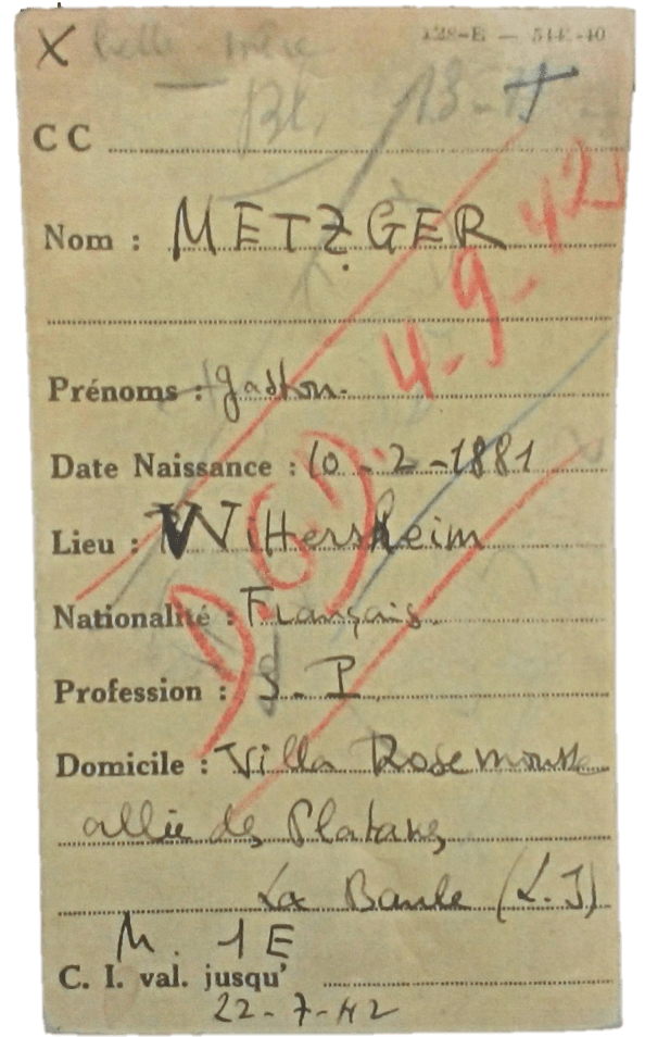 Fiche d’internement au nom de Gaston Metzger indiquant la date de son décès en rouge