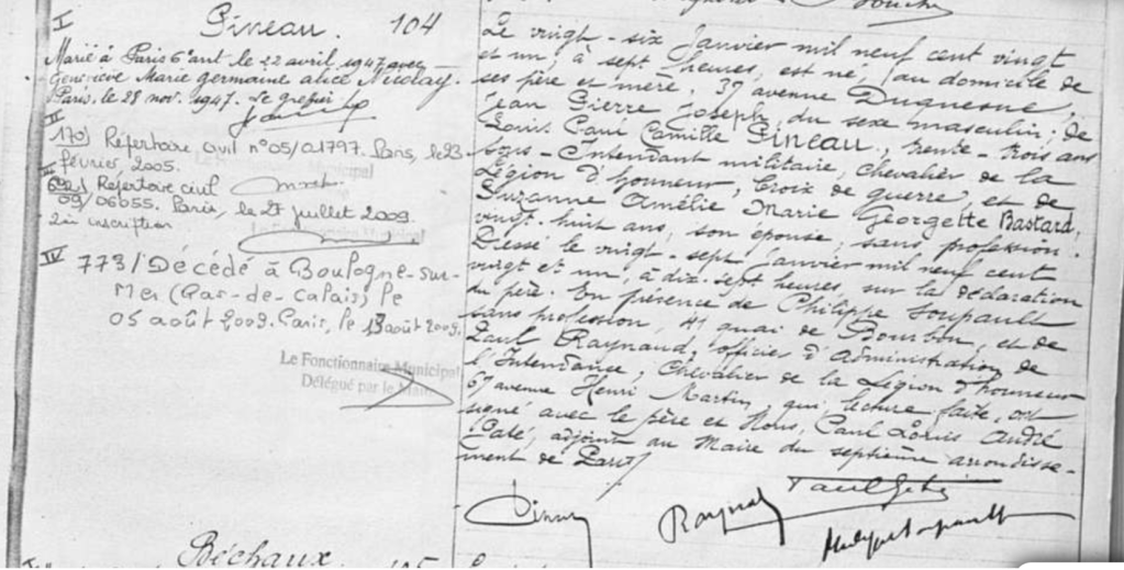 Acte de naissance de Jean Pineau. Paul Raynaud et l’écrivain surréaliste Philippe Soupault sont les témoins. Source : Archives de Paris (7N 140_A, vue 5/31)