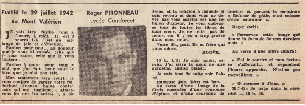 Lettre de Roger Pironneau à ses parents et à son frère, Paris, prison de la Santé écrite le 29 juillet 1942 et publiée dans La Voix de la Résistance en 1947. Source : Mont-Valérien