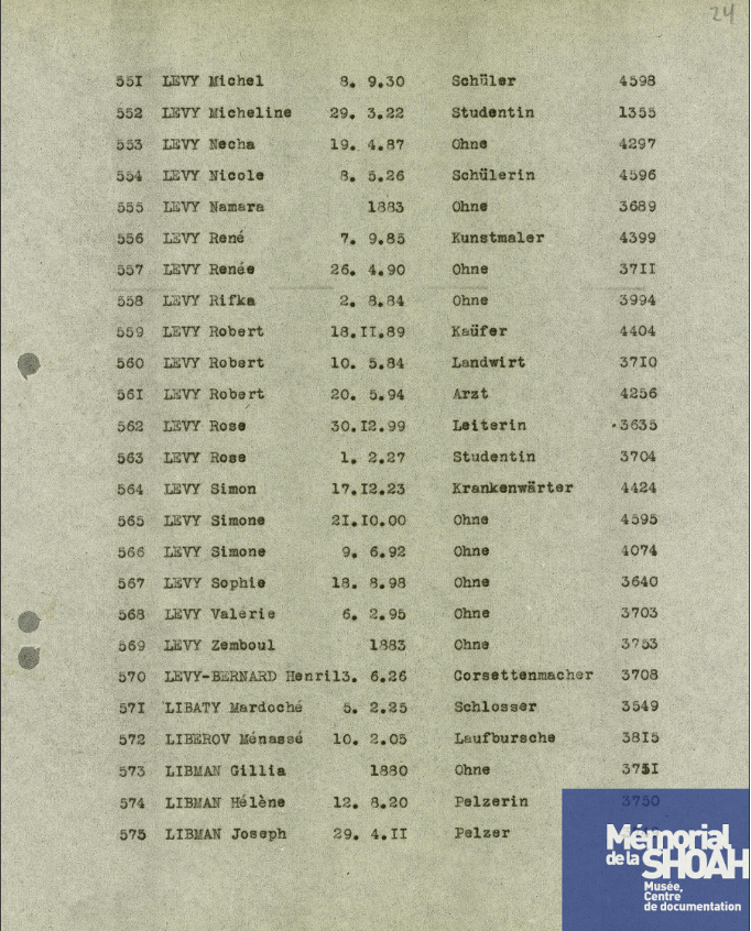 Liste du convoi 59 parti le 2 septembre 1943 de Drancy sur lequel apparaît le nom de Sophie Lévy. Source :