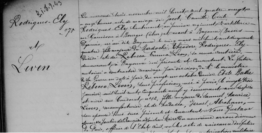 Extrait de l’acte de mariage de Jacob « Camille » Rodrigues-Ely et Berthe Leven. Source : Archives de Paris (V4E 3582, vue 26/31)