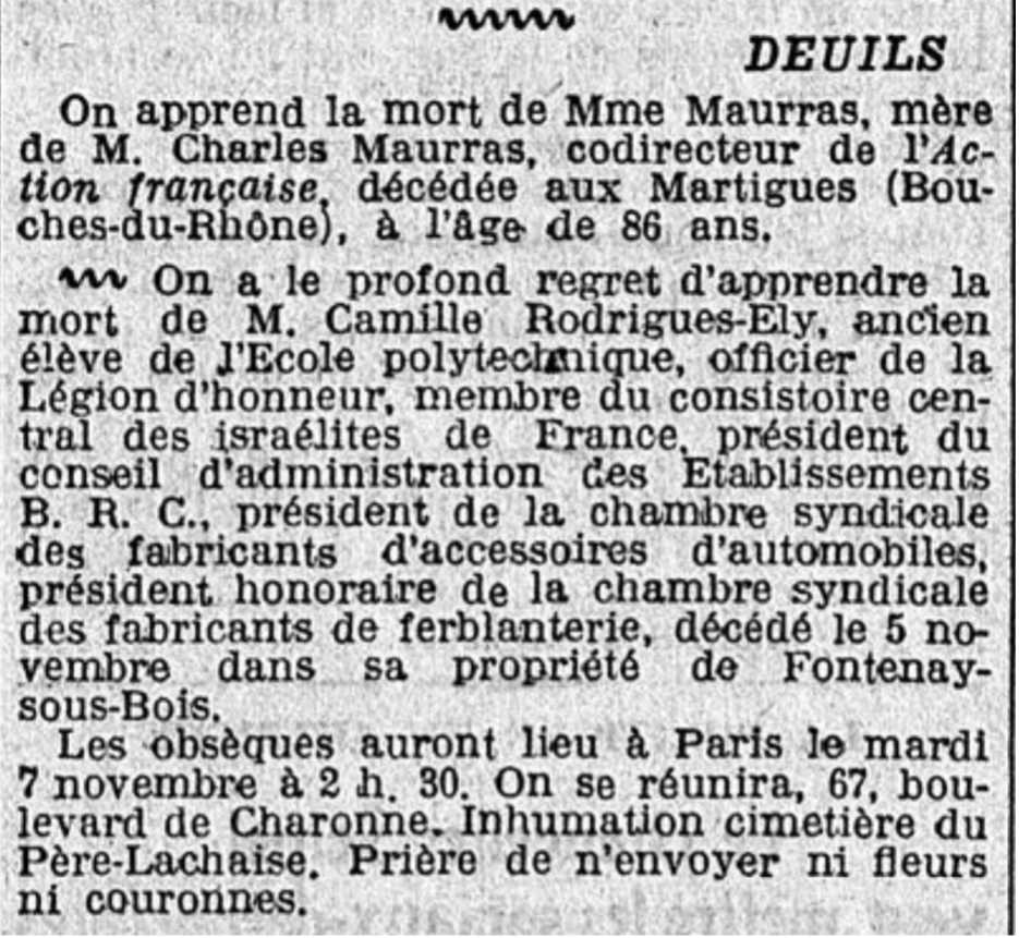 Avis de décès de Camille Rodrigues-Ely. On ne manquera pas de remarquer l’avis le précédant… Le Matin, 6 novembre 1922