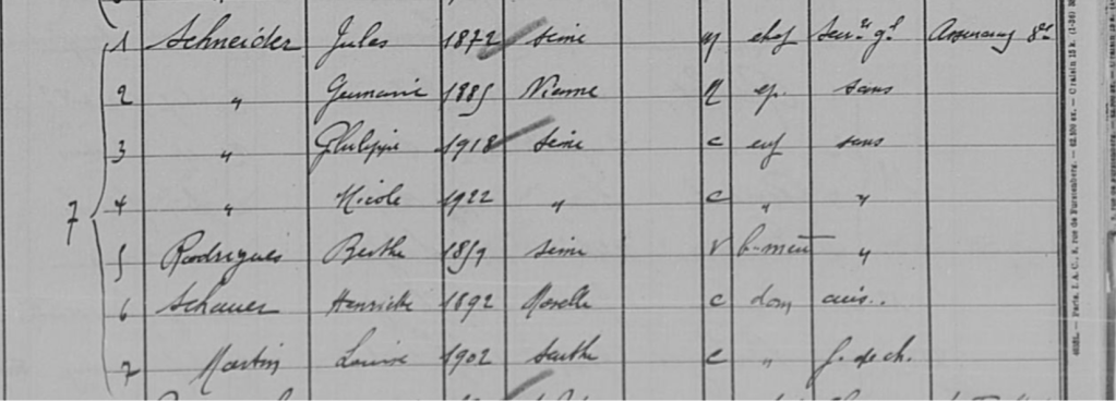 Recensement de 1936 indiquant que Bonne Maman habite avec la famille de sa fille, Germaine Schneider qu’Hélène appelle Auntie Ger. Source : Archives de Paris (D2M8 650 – La Muette – vue 56/243)