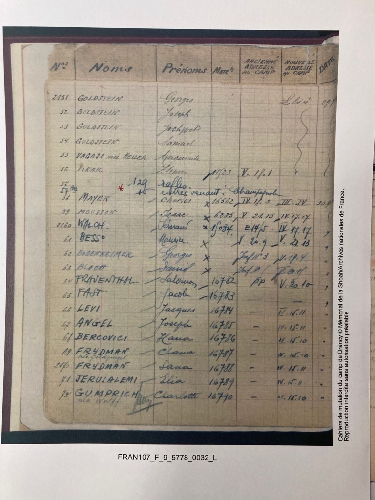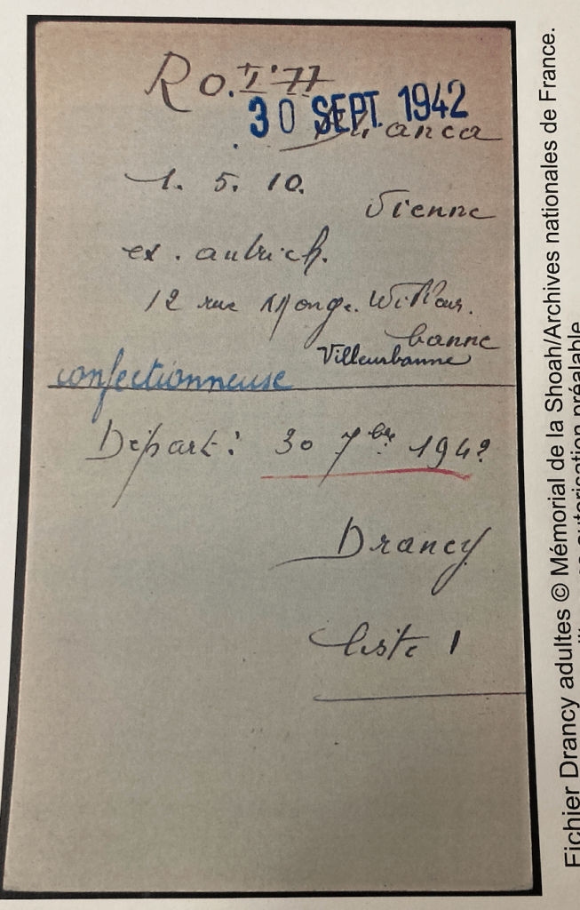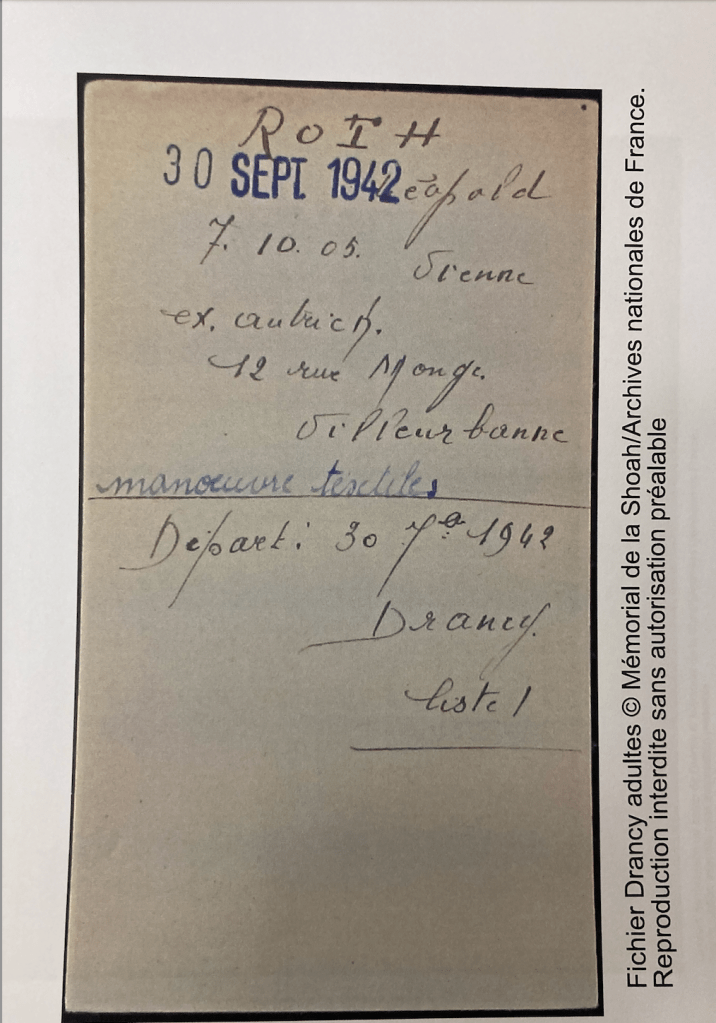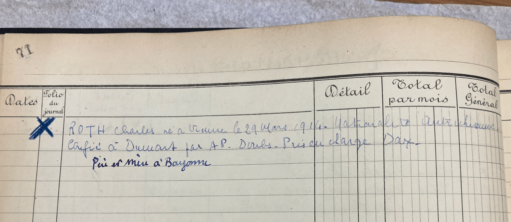 Détail du volume des comptes de l’oeuvre du Sauvetage de l’Enfance de 1921 utilisé pendant l’Occupation par l’Entraide Temporaire pour y camoufler ses activités clandestines. On y découvre le nom de Charles Roth. Chaque entrée suivait des codes bien précis : les dates étaient décalées de 20 ans – la date de naissance de Charles y est donc 1914 – Dax désignait l’Entraide Temporaire, Biarritz signifiait Drancy et Bayonne en déportation.Charles Roth a été admis à l’hôpital Rothschild le 30 septembre 1942 et remis à l’UGIF le 10 février 1943Les parents de Charles, Leopold et Bianca/Blanca ont été déportés par le convoi 39 parti le 30 septembre 1942Le premier cahier de mutations de Drancy dont on dispose ne concerne que les jours impairs du 15 septembre au 15 décembre 42. Une théorie est que les Roth sont arrivés à Drancy le 29 septembre parmi les 15, non immatriculés, venus de Champagnole. Ce que pourrait supporter la mention « confié par l’AP du Doubs » dans le volume de l’Entraide Temporaire. Le cas échéant, on peut penser que la famille a été arrêtée alors qu’elle tentait de passer la frontière suisse. Autre thèse possible : la famille est arrivée à Drancy de Châlon-sur-Saône, parmi les 17 non immatriculés, le 28 septembre 1942 :