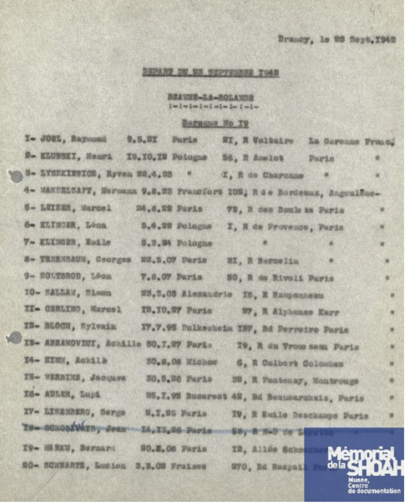 Liste de la baraque 19 à Beaune-la-Rolande sur laquelle figure Lucien Schwartz. Source : Mémorial de la Shoah